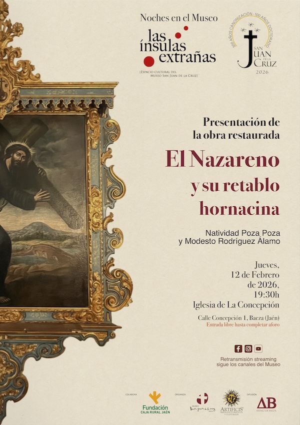 Presentación del magnífico cuadro del Nazareno y de su retablo hornacina, obras del siglo XVII, restauradas con la colaboración de la Fundación Caja Rural y por medio de los especialistas Natividad Poza Poza y Modesto Rodríguez Álamo, los cuales expondrán las principales características de la obra y de su proceso de restauración, tras las palabras introductorias de los responsables de la Fundación Caja Rural. Además, el acto servirá de reapertura solemne de nuestra iglesia, tras las recientes mejoras: saneamiento de humedades, pintura integral e incorporación de algún otro cuadro antiguo al conjunto iconográfico del templo. Por este motivo, las palabras finales de agradecimiento de fray Antonio Ángel Sánchez Cabezas, como representante de la comunidad de Carmelitas Descalzos, serán también un breve discurso acerca de lo que implica este nuevo enriquecimiento de dicho conjunto iconográfico. Para una mayor y mejor difusión del acto contamos con la colaboración del Ateneo de Baeza