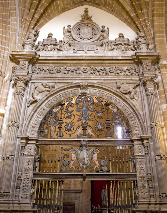 El conjunto está rematado por una magnífica reja de forja, de las más sobresalientes de la ciudad, obra del artesano Juan Álvarez de Molina. En ella se muestran las armas de su fundador, enmarcadas por tenantes y glifos, dentro de un programa iconográfico de exaltación mariana. El dorado y policromado de la reja corre a cargo del maestro Antonio de Aquiles.