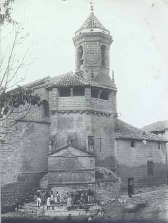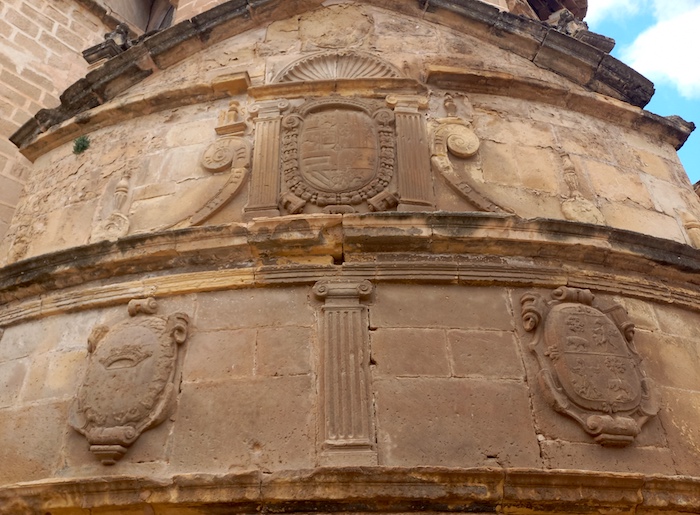 Sus señoriales escudos aparecen labrados en los dos cuerpos superiores de la fuente, a la que se dota de una imagen moderna y monumental. Pues, no en vano, representa el poder civil y público en un recinto con fuerte carga presencial. Digamos que es todo un símbolo, un mensaje a la ciudadanía. Fue labrada en el año 1590 al más puro estilo renacentista por los canteros Alonso de Alarcos y Diego Gil. Y terminada un año más tarde, según reza en la inscripción. El conjunto, está coronado por un gran frontón triangular, rematado por una cruz.